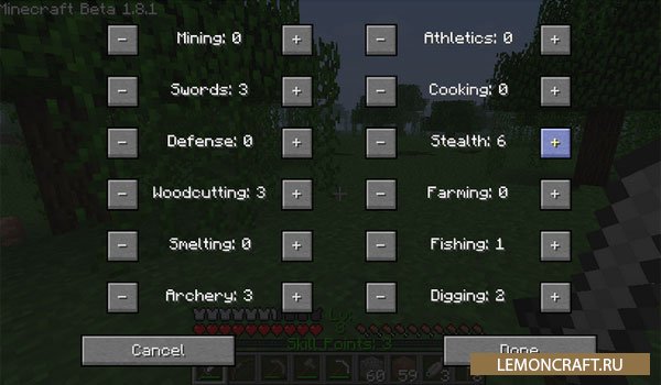 Мод Level Up предназначен для стимулирования вашего участия в игре. С этим модом вы получите новые навыки, которые можно будет прокачивать. Для примера, чем больше вы убиваете мобов тем больше растет ваша сила. Если вы любите готовку, то с каждым новым блюдом увеличивается навык их приготовления, ну и так далее.